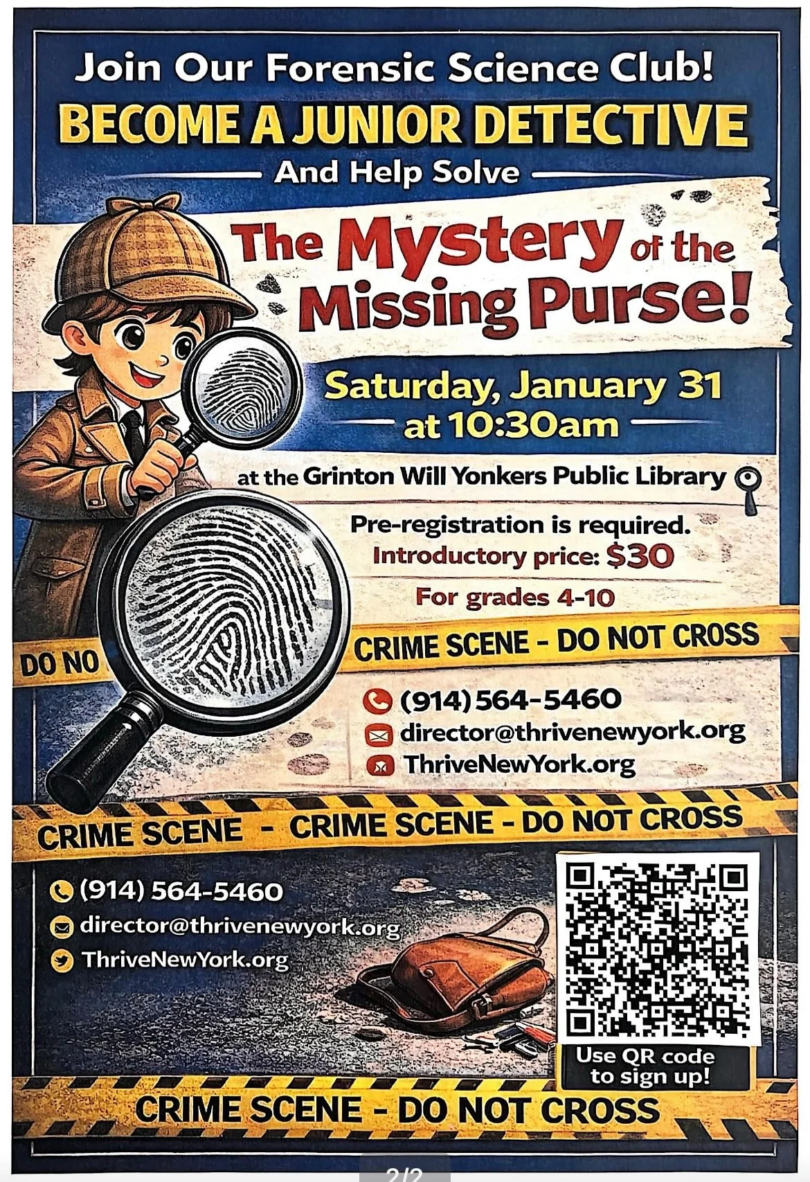 Let your child step into the exciting world of investigation with our Forensic Science Club, a fun and hands-on STEM workshop designed for students in grades 4–10. In this interactive experience, young learners become junior detectives as they work together to solve “The Mystery of the Missing Purse.” The workshop takes place at the Grinton Will Yonkers Public Library, creating a welcoming and engaging learning environment.
